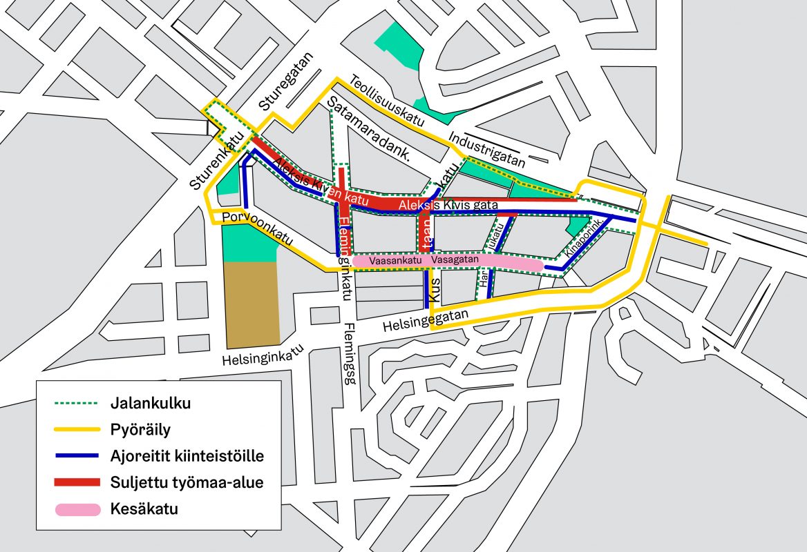 - Katutyöt ja vesihuollon saneeraustyöt Aleksis Kiven kadulla välillä Kustaankatu-Helsinginkatu, Vaasankadulla välillä Harjukatu-Kinaporinkatu sekä Kinaporinkadulla ja Fleminginkadulla välillä Aleksis Kiven katu-Teollisuuskatu valmistuvat arviolta kesäkuun 2025 loppuun mennessä.